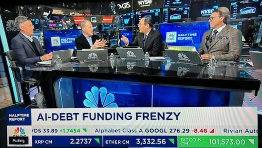 Judge led off Friday's (10/3) Halftime Report with "AI bubble talk" (snicker) and mentioned David Solomon's and Jeff Bezos' comments.