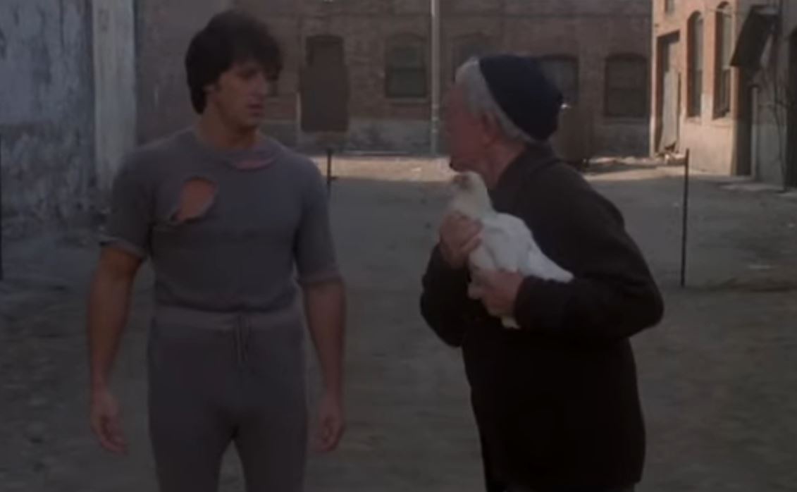 Well, um, that's kinda misstating it. The movie is "Rocky II," and his trainer (Mick) is showing Balboa some old-school training methods, which includes chasing a chicken and catching it with the idea of improving one's quickness.