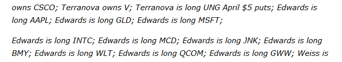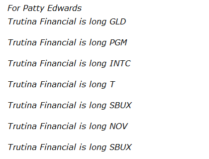 Note that Edwards' Tuesday disclosures (top) are all attributed to "Edwards," whereas Friday's disclosures are all attributed to "Trutina Financial." 2 of the positions, GLD and INTC, are the same. On Friday, Edwards on TV said she had been "adding" to gold positions she had never sold out of, without distinction between client or personal account; the same for when she said "I own National Oilwell Varco." (To her credit, Edwards regularly does state on television whether she owns shares for clients and is perhaps most inclined of all the show's panelists to declare long positions.)