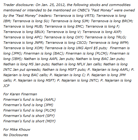 More telling is this passage: "The Fast Money Participants, CNBC, its affiliates and/or subsidiaries are not under any obligation to update or correct any information available on this website. The Fast Money Participants are professional traders who may be actively involved in securities discussed herein, on behalf of themselves, their companies and their clients. ... Also, the opinions expressed by the Fast Money Participants may be short-term in nature and are subject to change without notice."