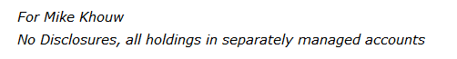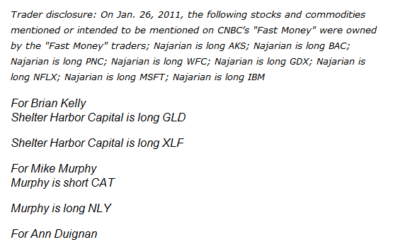 Update (Feb. 1): This site noted in a special report issued Tuesday on the incompleteness and uselessness of Fast Money disclosures, that the official CNBC.com Fast Money disclaimer contains terminology such as this: