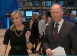 During some discussions, such as this chat below between Sue Herera and Bob Pisani, viewers get the kitchen sink — curtains just behind, the archway in the distance, corporate logos at various depths, a screen with tiny trading data, and a sizable "Power Lunch" logo.