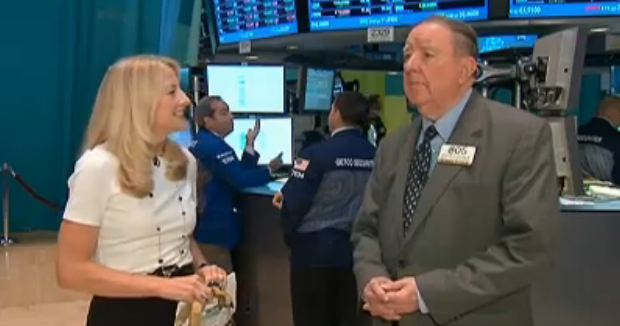 And what exactly constitutes "action" on a trading floor nowadays? Here below is a typical sighting of a mid-morning Art Cashin report, only 2 traders behind sitting around presumably not taking FB orders but talking football, and an unused dance floor (or something like that) behind Mary Thompson:
