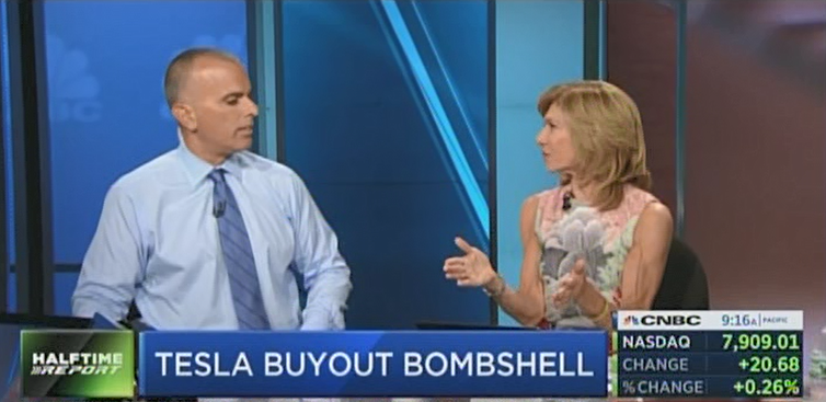 Karen Finerman on the Wednesday (8/8) Fast Money of course decried Elon Musk's tweet, but Guy Adami suggested the Saudis are to Tesla what the Fed is to the S&P 500. On the Halftime Report, Scott Wapner said Mike Wilson is clinging to his rolling bear market theory.