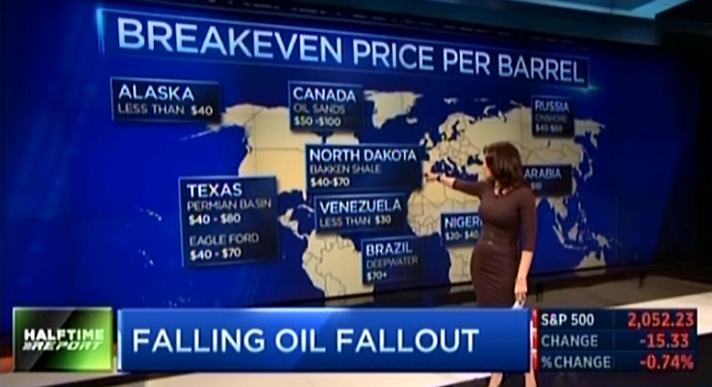 Michelle Caruso-Cabrera, in a stunning oil presentation on Monday's Halftime Report, explained the break-even levels for shale drillers and what prices are needed by which countries to balance their budgets.