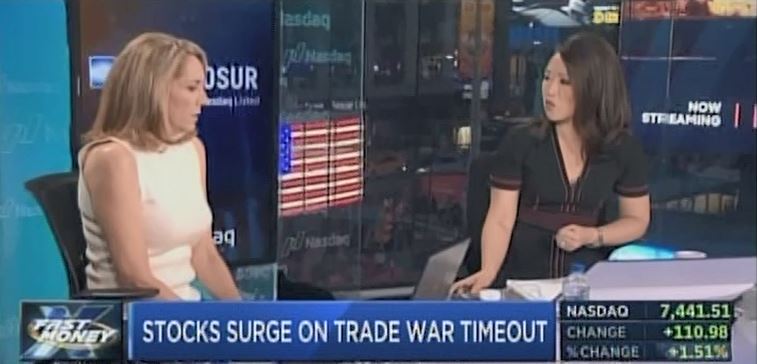 We noticed, however, that the Fast Money crew was assembled not at the Nasdaq but Englewood Cliffs as though it were a glorified Power Lunch. Karen Finerman, dynamite in sleeveless two-tone, expressed more hesitancy than Lee Cooperman of hours earlier. Karen said of the Huawei situation, "That is not gonna go unanswered. So I think we're in for more bad news on the tariff front."