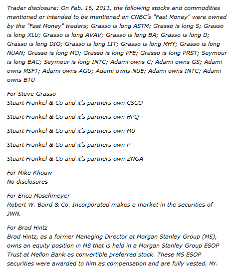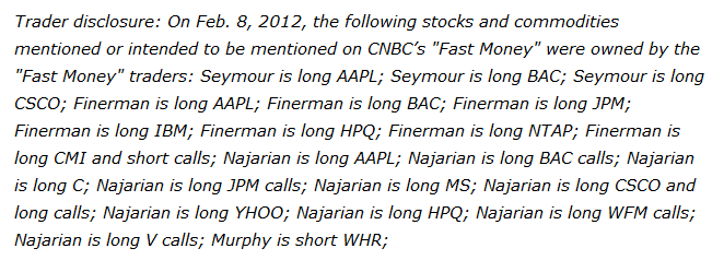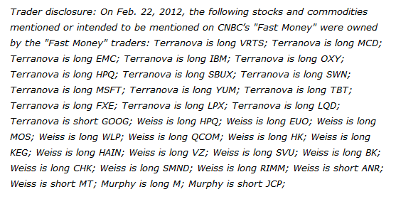 While the CNBC gang on the 5 p.m. Fast Money furiously combed through Facebook's S-1, nobody evidently was combing for Karen Finerman's or Mike Khouw's disclosures for Wednesday's program.