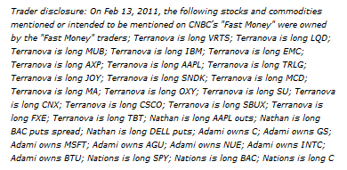 Anyone actually following along at home — and CNBC clearly thinks or hopes nobody is — wondering if Finerman still has the MSFT, AAPL, GOOG and GPN positions that CNBC.com disclosed Tuesday of stocks mentioned on Wednesday came up empty-handed on Wednesday, as the Fast Money disclosures proved utterly silent for both Finerman and Mike Khouw, who recommended a trade for people who have been long WHR; "one of the things you might look to do if you were fortunate enough to ride it up here is possibly sell some upside calls against it," specifically the June 65s.
