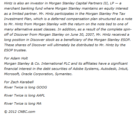 Guy Adami on Wednesday hailed MSFT, saying, "I still think it has further room on the upside." This was adequately disclosed Wednesday online (for Adami, not perhaps Finerman), where Adami has listed owning it for years, but producers didn't see fit to note that on television.