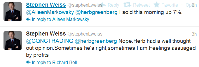 It was revealed that Stephen Weiss that sold 3/4 of his BRCM position a day ago, but he said he "bought some in the aftermarket last night," though not enough to refill the position.
