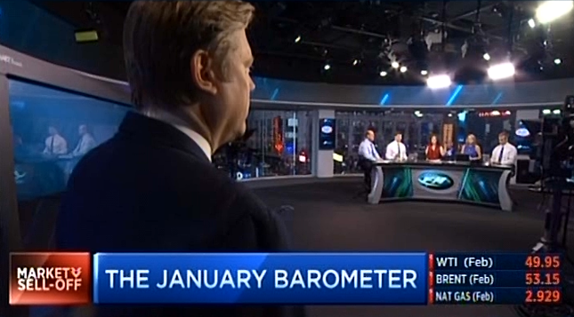 So the 5 p.m. Fast Money crew debuted Monday in its sleek new upstairs set ... and produced as their star guest Carter Worth, to recite the same stats he recited a year ago about how January results signal how the whole year will turn out, a presentation that 1) wasn't remotely challenged by the panel despite the fact it didn't work last year and 2) could probably reach the same conclusion for any other month besides January, but nobody volunteered to Kensho (sic verb). Jon Najarian probably would've done it, given his astute observation at Halftime that this will probably be a great week to buy after everyone rinses out their capital gains, but he wasn't around.