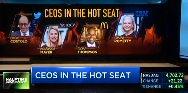 It would be a stretch to say that Scott Wapner's Halftime Report on Wednesday muscled out McDonald's CEO Don Thompson — especially because Judge has been looking the wrong direction all along and waging a bizarre 2-man campaign (consisting of 1 analyst stating only, depending on the day, that it's "possible" and a "good chance") to pressure Twitter's chief into some kind of ouster in favor of a guy who ... yes, this is what he said on television ... actually wants TWTR to buy YHOO — but it was nevertheless impressive to realize hours after the program that Thompson, identified as a "hot seat" CEO, is out. (Dick by the way isn't going anywhere.)