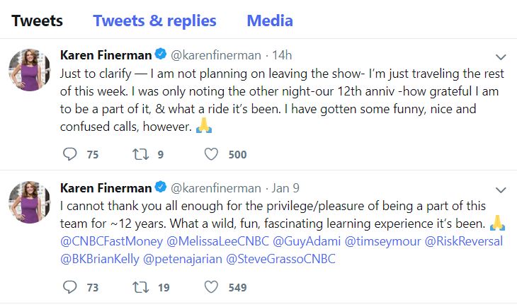 Eyebrows were raised around CNBCfix HQ the other day when we noticed Karen Finerman was tweeting to Fast Money colleagues, "I cannot thank you all enough for the privilege/pleasure of being a part of this team for ~12 years. What a wild, fun, fascinating learning experience it's been."