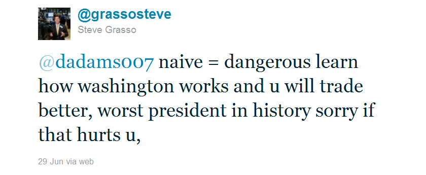 We discovered that Steve Grasso on Wednesday was not only dishing it out with Steve Liesman, but ended up in a tweeting donnybrook about how the 3 branches of federal government work, and who's responsible for what.