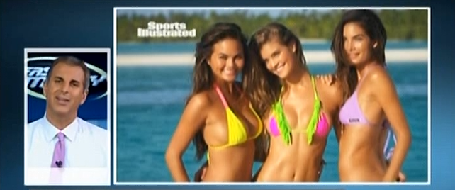 Mel, who featured a sharp new hairstyle and chic orange dress, explained, "I don't wanna see men's legs in the workplace," but CNBC should realize that the real value added from showing Sports Illustrated swimsuit video is not from the video, but the comments by Melissa (and Karen when she's there) about the airing of the video. That is cute.