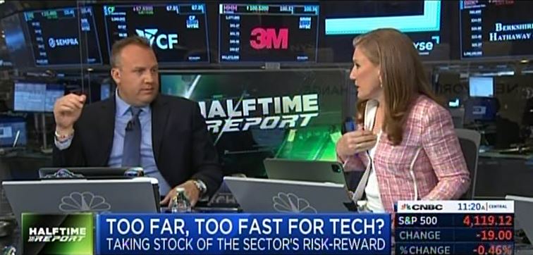 Judge on Wednesday's (4/5) Halftime Report asked Joe Terranova if Joe is buying either gold or the dip in tech. Joe promised to tell Judge "exactly what I'm doing" at the end of the month, though he acknowledged that being underweight tech and growth hasn't been so great.