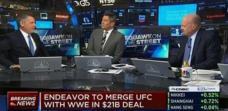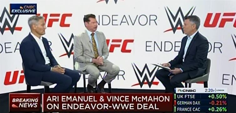Anyone who caught Squawk on the Street on Monday (4/3) got something of either a scoop or a treat or both when Judge turned up to introduce his "exclusive" interview, taped a day earlier in Los Angeles, with Ari Emanuel and Vince McMahon, who just shook hands on a deal for Endeavor to acquire WWE (or whatever the wrestling outfit is called now).