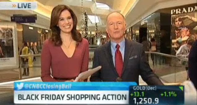 The Black Friday edition of Closing Bell was a dreadful exhibition, a train wreck of satellite delay while Evans relied on Bill Griffeth to actually call on the guests as the dead air crystallized. (See, this is one reason why confidence like Maria's is admirable, she doesn't waste time with that (bleep) and makes sure someone (generally herself) is always talking.)