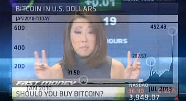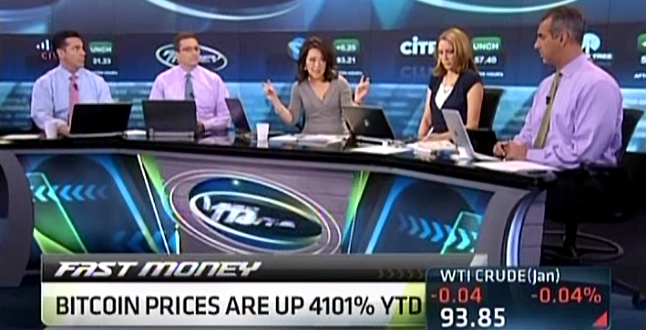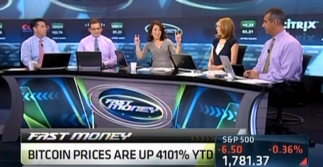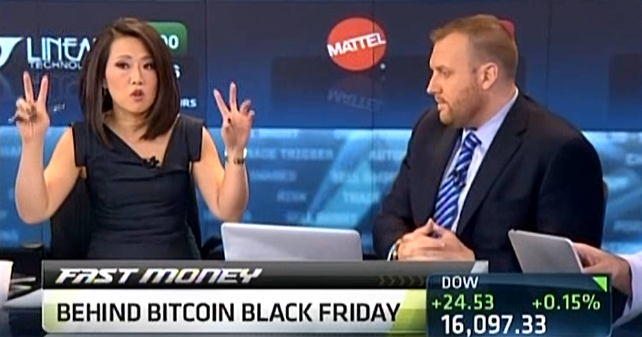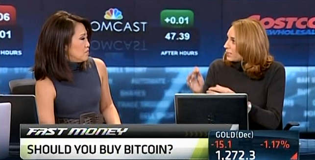 Kelly Evans, attempting to smooth the remarkably clumsy intros she's been handing to Melissa Lee from Closing Bell to Fast Money, came up with "Fast Bitcoin" on Wednesday.