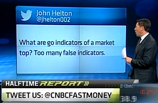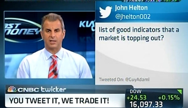 Guy Adami was given the same question from the same Twitterer as Simon Baker received at Halftime (see below), and curiously the answers were different as each suggested 3 things; Guy said the advance/decline line, IPO boom and increased volume on extremes of moves, whereas Simon merely said macro, fundamentals and technicals. (But the CNBC graphics crew cleaned up the grammar by 5 p.m.)