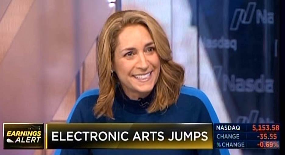 The conversation turned to video games, and the cameraman caught Karen Finerman in wonderful profile in 2-tone exquisite blue top and new hairstyle. Finerman said she would be short GME "forever," adding, "I can't believe it's still here, to be honest."