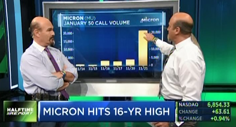 Doc said December 52.50 APC calls were popular. He said AIG puts were getting bought "in a pretty big way." Pete said November 45 MU calls were getting bought. Pete also said there's more buying in JD calls, the 42.50s.
