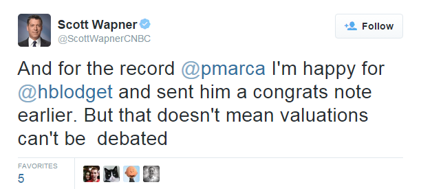 Judge then spent about a dozen tweets backpedaling and praising everyone from Blodget to Sally Pancakes to Linette Lopez to the staff custodians at Business Insider while refusing to answer Andreessen's reasonable question as to how much overvalued this transaction is.