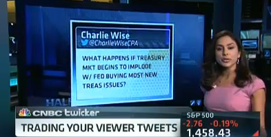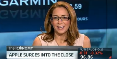 Later superfox Seema Mody — who did an eyebrow-raise at the end of her report that will stop you in your tracks — revealed Twitterers who like AAPL. Guest host Michelle Caruso-Cabrera said that brings out the contrarian in her, that everyone likes Apple, and that her guess for the Apple TV device is that it's a "really expensive TV remote control."