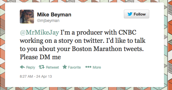 Boston police spokeswoman Cheryl Fiandaca gives Quintanilla just the type of quotes this production was looking for … even if they made little sense. Fiandaca said that police can more effectively use Twitter than communicate to the professional news media, which she implied is making up its own facts; "we can tell our own story … we can put out the information directly on Twitter." Evidently a press conference or press release is unfathomable. Perhaps journalists can use Twitter to solve crimes, and then neither side will need the other.